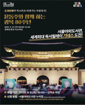 서울도서관 광복 80주년 기념 세계 최대 독서 릴레이 기네스북 도전(사진 서울시) ☞ 광복 80주년,윤동주 시인 서거 80주기에 맞춘 ‘독서 릴레이’서울시는 광복 80주년과 윤동주 시인 서거 80주기를 맞아 9월 27일(토) 광화문광장에서 시민들과 함께 ‘세계 최대 독서 릴레이(Largest Reading Relay)’ 기네스북 도전에 나선다. 독서 릴레이는 윤동주 시인의 유고 시집 『하늘과 바람과 별과 시』 전문을 시민들이 한 문장씩 이어 낭독하는 방식으로,문학으로 저항에 나섰던 시인 윤동주를 통해 광복 80주년이라는 역사적 의미를 되새긴다.현재 기네스북에 등재된 ‘독서 릴레이’ 세계 기록은 인도에서 『간디 자서전』을 낭독한 3,071명이다. 서울도서관은 광복 80주년,윤동주 서거 80주기의 의미를 담아 3,180명을 목표 인원으로 설정해 역사적 의미를 더했다. 또한 이번 도전은,문화 확산 모델을 선보인 서울야외도서관의 하반기 재개장과 함께 진행돼 시민들과 함께 특별한 독서 경험을 나눌 예정이다. ‘기네스북 독서 릴레이’ 모집 및 참여와 관련한 자세한 내용은 서울야외도서관 누리집과 공식 SNS를 통해 확인할 수 있다.[글 시티라이프부 이승연 기자 lee.seungyeon@mk.co.kr][