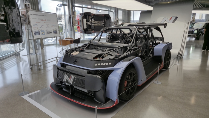 현대 모터스튜디오 서울 3층에 전시된 ‘RN24 롤링랩’ [한창호 기자] 3층과 4층은 현대차의 신차를 만나볼 수 있는 차량 전시 공간으로 꾸며졌다. 3층에는 N 브랜드 전용 공간이 마련돼 움직이는 차량 실험실로 불리는 ‘RN24 롤링랩’부터 ‘N 퍼포먼스 파츠월’,레이싱 게이밍 존 등 다양한 콘텐츠가 준비됐다. 4층은 현대차의 전기차 전용 브랜드 아이오닉 차량 전시와 직접 차량 컬러 조합을 경험할 수 있도록 하는 다이캐스트 월 등으로 구성됐다.