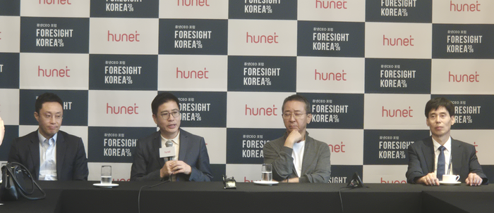 30일 낸 사업 전략 수립을 고민하는 최고경영자(CEO)를 위해 ‘포사이트 코리아(휴넷CEO 포럼)’에서 기자간담회가 열리고 있다. (사진 인쪽부터) 김주수 휴넷 연구원장,조영탁 휴넷 대표,김재식 서울대 경제학부 명예교수,권영수 전 LG에너지솔루션 CEO(부회장)·고문. [사진 출처 = 최종일 기자] “애플·테슬라 예시…창의와 혁신이 필요”