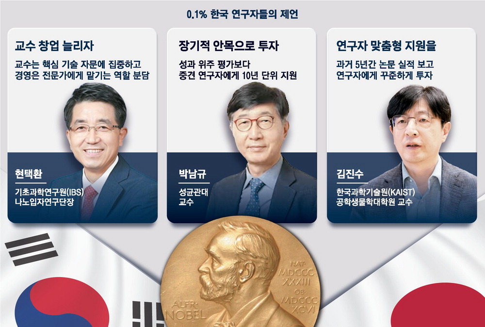"과학을 지금처럼 '경제 발전의 도구'로만 보는 한 '노벨 클래스'는 요원하다. 연구자들의 실패를 용인하고 10년이고 20년이고 장기 지원하는 근본적인 체질 개선에 나서야 한다."