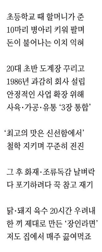 젊은 사업가로서 그는 앞길을 내다보는 예견력이 있었다. 사업을 안정적으로 확장하려면 '사육·가공·유통'을 한 손에 쥐어야 한다고 본 게 대표적이다. 병아리를 키우는 데서 그치지 않고 도계장과 가공공장을 만들어 그 둘을 시장과 연결한 배경이다. 그 유명한 '3장의 통합'이다.