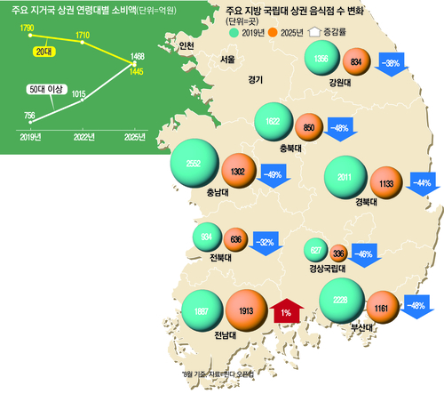 이종우 아주대 경영학과 교수는 “대학교 근처는 대학생들을 겨냥한 가성비 좋은 매장이 많은데,줄어들거나 떠난 청년들의 자리를 중장년층이 겨우 메우고 있는 상황”이라고 분석했다.