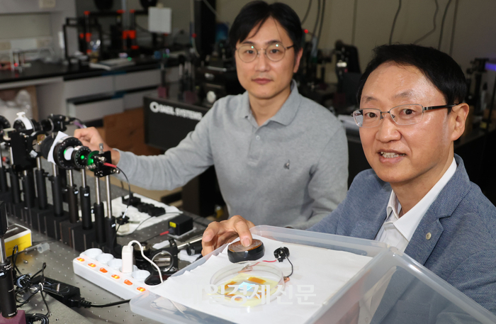 박재형 서울대 교수와 홍용택 서울대 교수(오른쪽) [이승환기자] “미래 공간 디스플레이는 크게 두 가지 범주로 구분할 수 있다. 하나는 ‘윈도 타입 공간 디스플레이’,다른 하나는 ‘볼류메트릭 공간 디스플레이’다.”