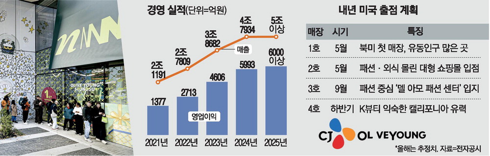 국내 최대 화장품 오프라인 유통기업 CJ올리브영이 내년 미국에 새로 내는 점포 수를 당초 계획보다 늘려 4개를 개점하겠다고 발표하면서 해외 시장 공략에 속도를 붙이고 있다. 올해 매출이 처음으로 5조원을 넘어설 것으로 예상되는 등 국내 오프라인 화장품 유통시장에서 독보적인 1위를 차지한 데 이어 해외 관광객들의 필수 코스로 자리 잡은 여세를 몰아가겠다는 전략으로 보인다. 향후 다른 지역 공략에 나설 것이라는 게 뷰티업계 전망이다.