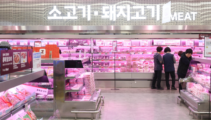 서울 시내 대형마트에서 시민들이 장을 보고 있다. [이충우 기자] 돼지고기와 한우,닭고기 가격이 일제히 상승하며 축산물 가격이 전반적으로 급등세를 보이고 있다. 쌀과 일부 과일 가격도 오름세를 이어가면서 밥상 물가 부담이 커지고 있다.