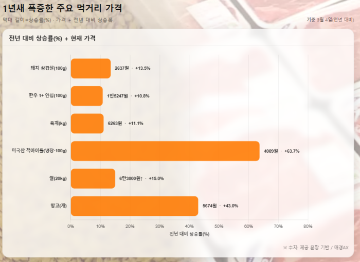 공급 감소와 환율 상승 영향으로 수입 소고기 가격도 급등했다. 미국산 척아이롤(냉장)은 100g당 4089원으로 1년 전보다 63.7% 상승했다.
