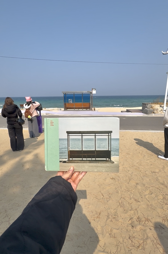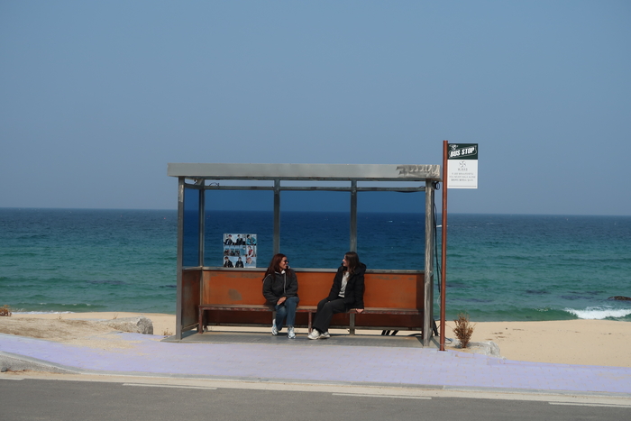 BTS 버스정류장/사진=김지은 여행+ 기자 현재의 정류장은 실제 촬영 세트가 아닌 재설치된 공간이다. 촬영 당시 사용된 구조물은 철거됐지만,배경지에 대한 관심이 높아지면서 강릉시가 동일한 형태로 다시 조성했다. 이후 ‘BTS 정류장(BTS Stop)’으로 불리며 외국인 관광객이 꾸준히 몰리고 있다.
