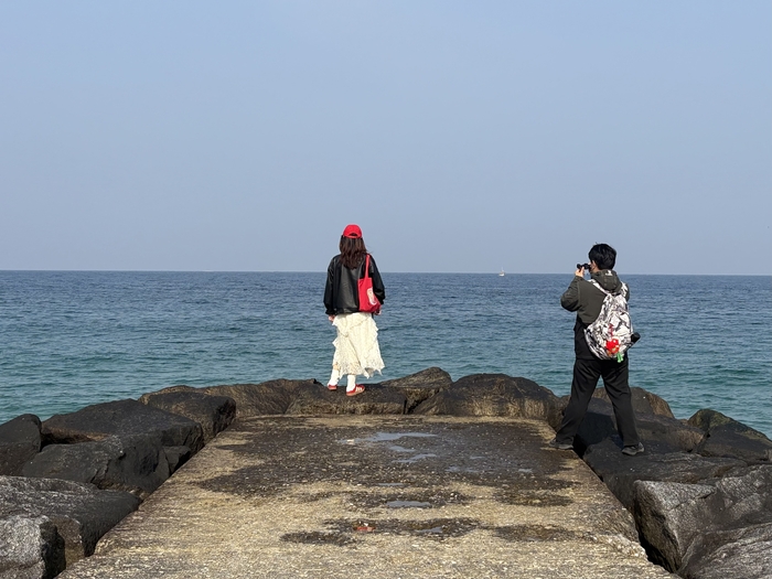드라마 도깨비 촬영장에 방문한 중국인 관광객/사진=김지은 여행+ 기자 BTS 정류장과 차로 10분 거리인 주문진 도깨비 촬영지도 인기다. 2016년 방영한 tvN 드라마 ‘도깨비’에 배경으로 등장하며 이름을 알린 이곳은 시간이 지난 지금도 K-콘텐츠를 사랑하는 외국인 관광객의 발길이 이어진다.