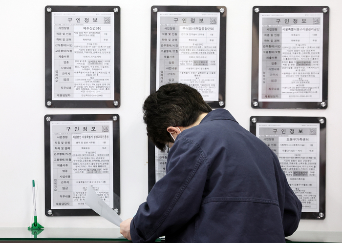 이날 서울 마포구 서울서부고용복지플러스센터를 찾은 한 구직자가 일자리정보 게시판을 살펴보고 있다. 2026.4.15/뉴스1 지난달 취업자 수가 1년 사이 20만명 넘게 늘면서,두 달 연속 20만명대 증가세를 보였다. 고용률도 통계 작성 이후 최고치를 경신했다. 하지만 청년층은 코로나19 여파 이후 가장 높은 실업률을 기록했다.