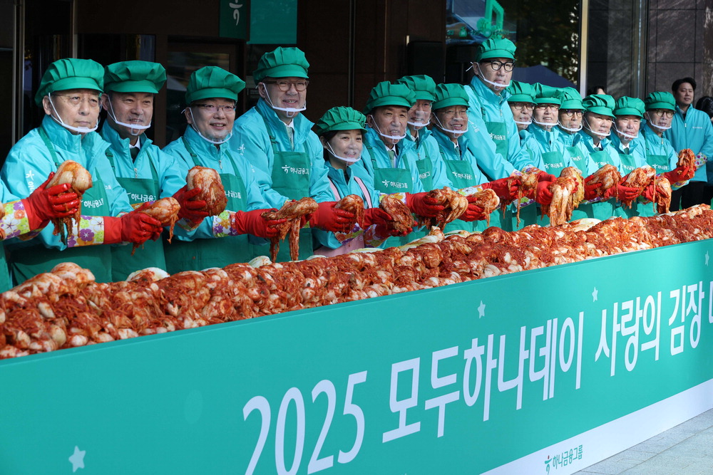 하나금융이 그룹 ESG(환경·책임·투명경영) 행사인 '2025 모두하나데이' 개최를 기념해 '사랑의 김장'에 나섰다. 10일 열린 행사에서 이호성 하나은행장,이은형 하나금융 부회장,김연
