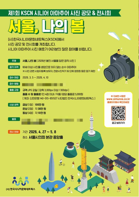 (사)한국시니어문화네트웍스(KSCN)는 ‘제1회 KSCN 시니어 아마추어 사진 공모&전시회’를 개최한다고 4일 밝혔다. 이번 공모&전시회는 ‘서울, 나의 봄’을 주제로 2026년 서울의 봄을 담은 사진작품을 모집한다. 공모 기간은 5일부터 4월 10일까지이며, 선정된 우수작은 4월 27일부터 5월 8일까지 서울시의회 중앙홀에서 전시될 예정이다. 이번 행사는