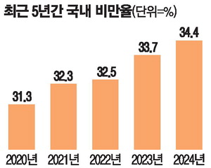 질병관리청 2024년 건강조사성인비만율 10년새 26%→34%치솟은 男비만율, 여성의 1.8배
