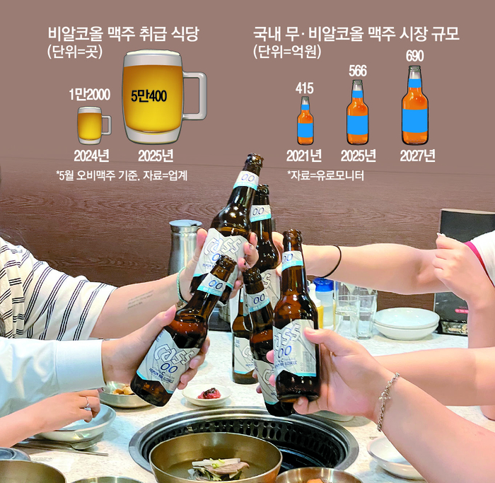 겉은 술인데 알코올 1% 미만 판매식당 5만곳, 1년 새 5배↑ 분위기 내면서 숙취 걱정 없어 젊은 직장인들 중심 급속 확산 식당선 오비, 가정 하이트 1위