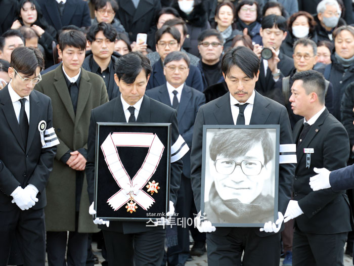 고(故) 안성기 추모 미사·영결식이 9일 오전 서울 명동성당에서 엄수됐다. 영정과 금관문화훈장은 정우성, 이정재가 들고 설경구, 유지태, 조우진, 박해일, 주지훈, 박철민이 고인을 운구했다. 2026.1.9 #‘국민배우’ 안성기, 오늘 영면 #정우성-이정재, 안성기 영정과 훈장 들고 #안성기, 동료들 배웅 속 영면 #유지태, 안타까운 마음뿐 #주지훈, 침